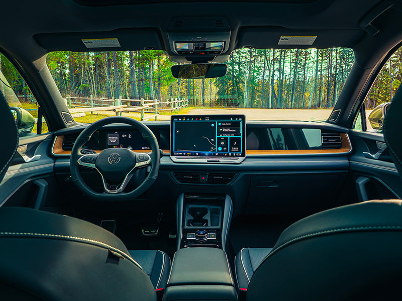 Volkswagen has chosen to offer the Turbo engine exclusively in the Highline Turbo R-Line, simplifying the buying process. This trim includes distinctive exterior elements such as 20-inch York alloy wheels, R-Line bumpers and side sills, illuminated logos, and Turbo badging, giving the vehicle a more assertive presence on the road.